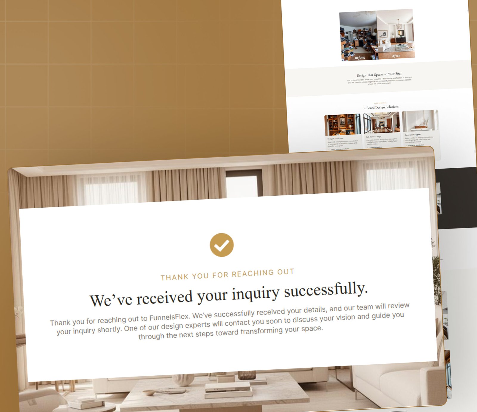 This is the first page people see when they visit your funnel. It is designed to grab attention, show your interior design expertise, and get the visitor excited about working with you.