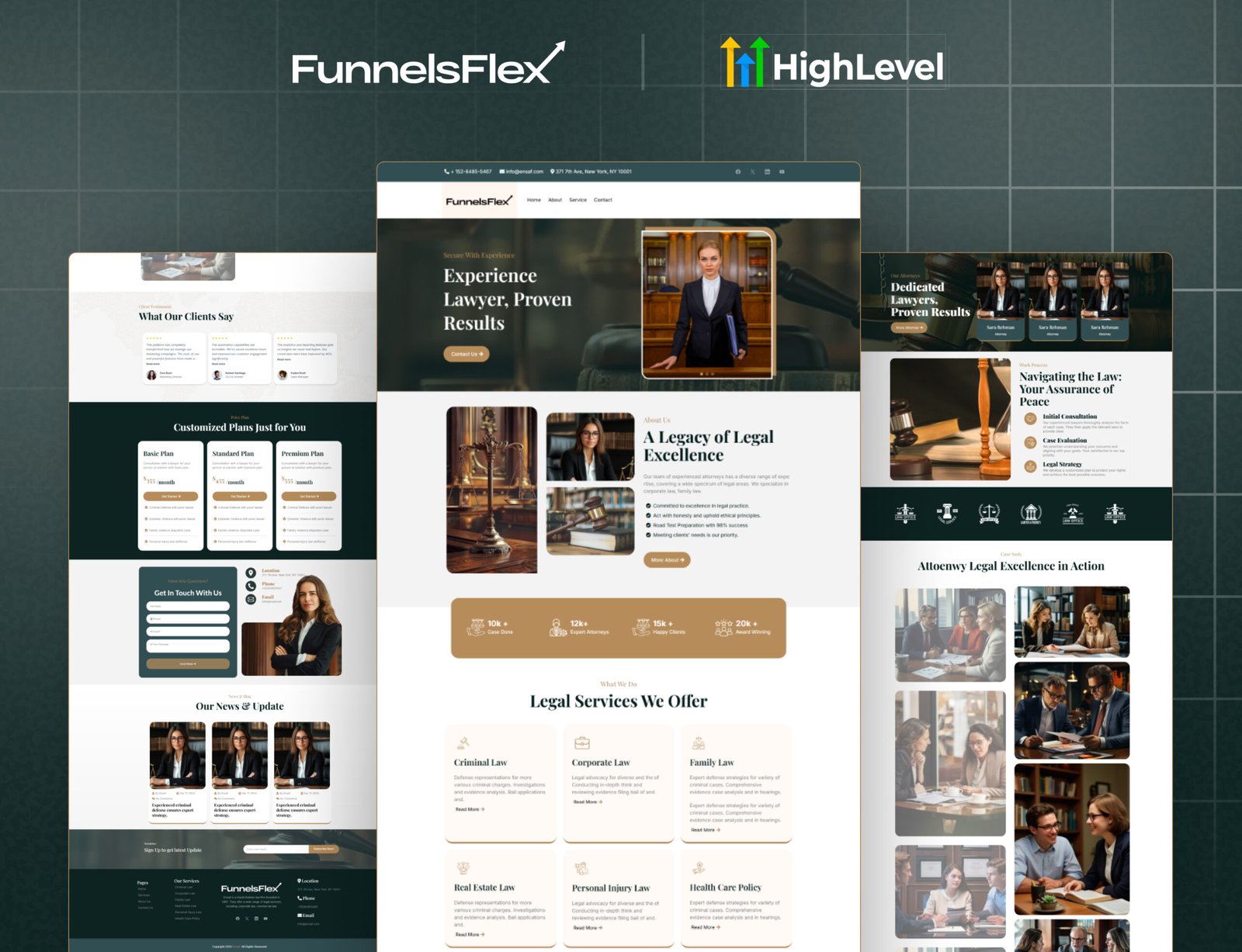 A powerful homepage layout featuring a clear firm overview, your core practice areas, trust-building elements, and a strong call-to-action guiding visitors to book consultations through your GoHighLevel Legal Services Funnel.
