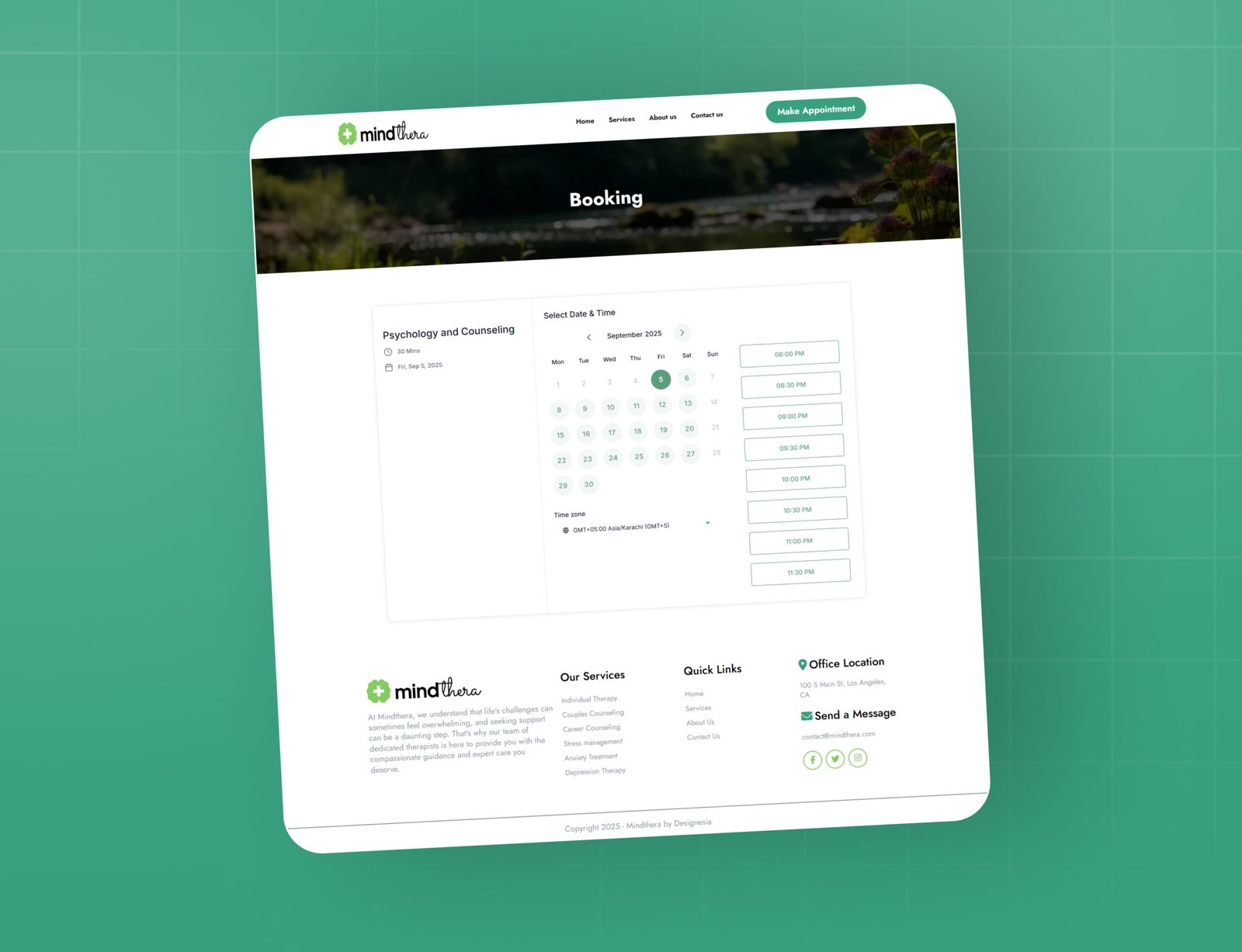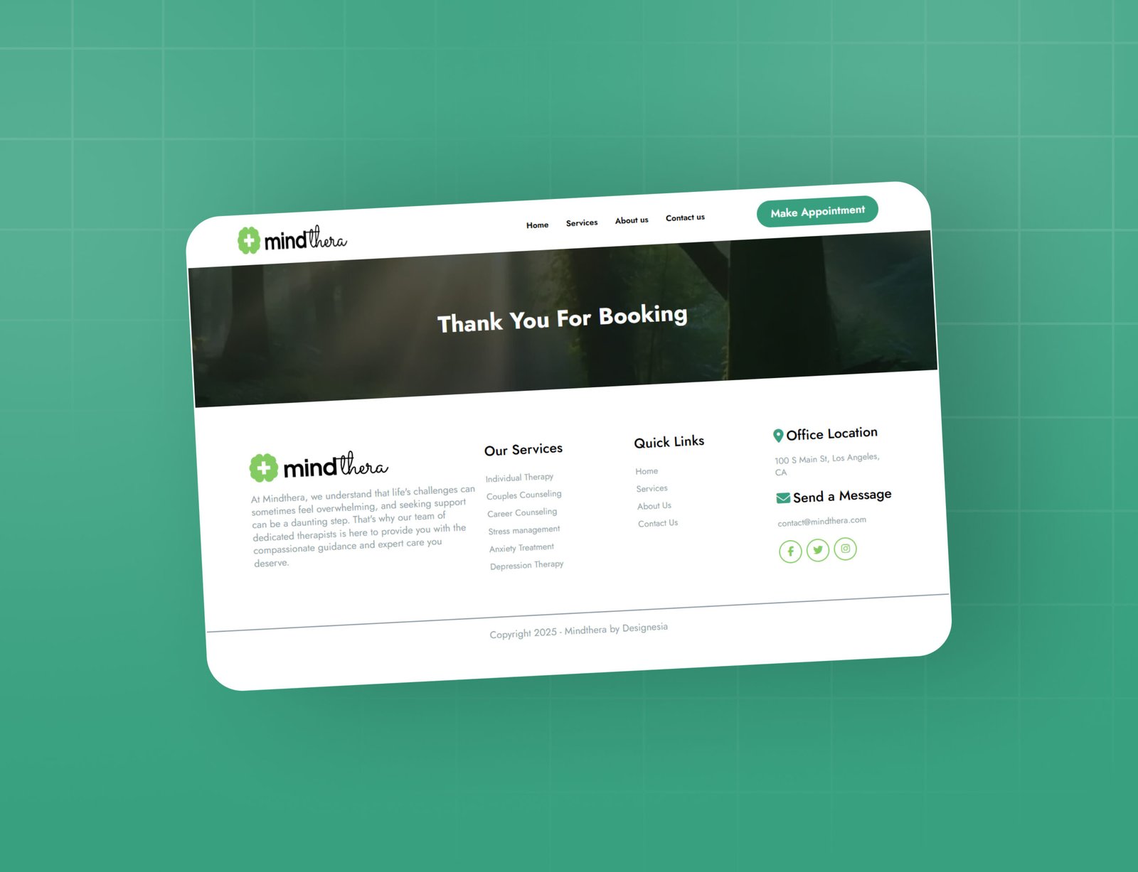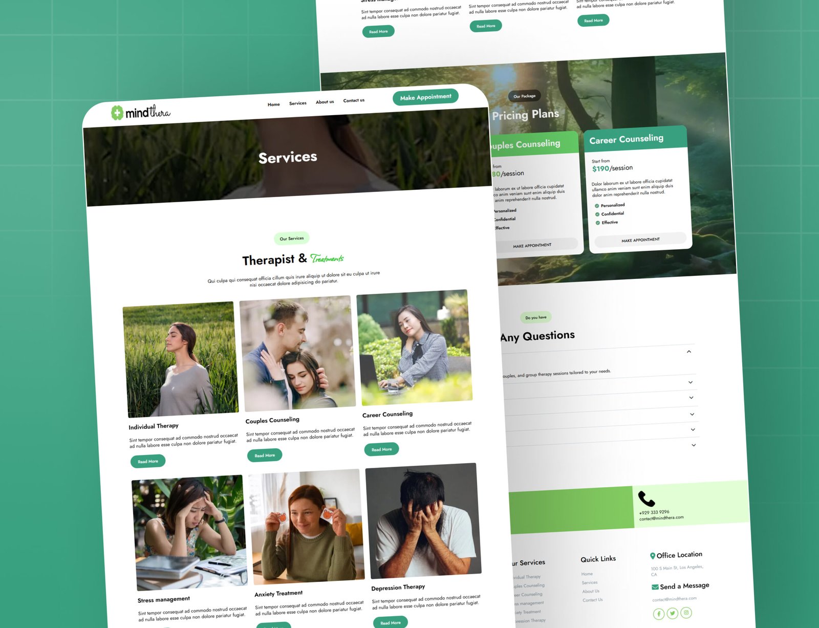 • Services Page: Clearly outlines your therapy offerings, from individual and couples counseling to stress, anxiety, and depression treatment.