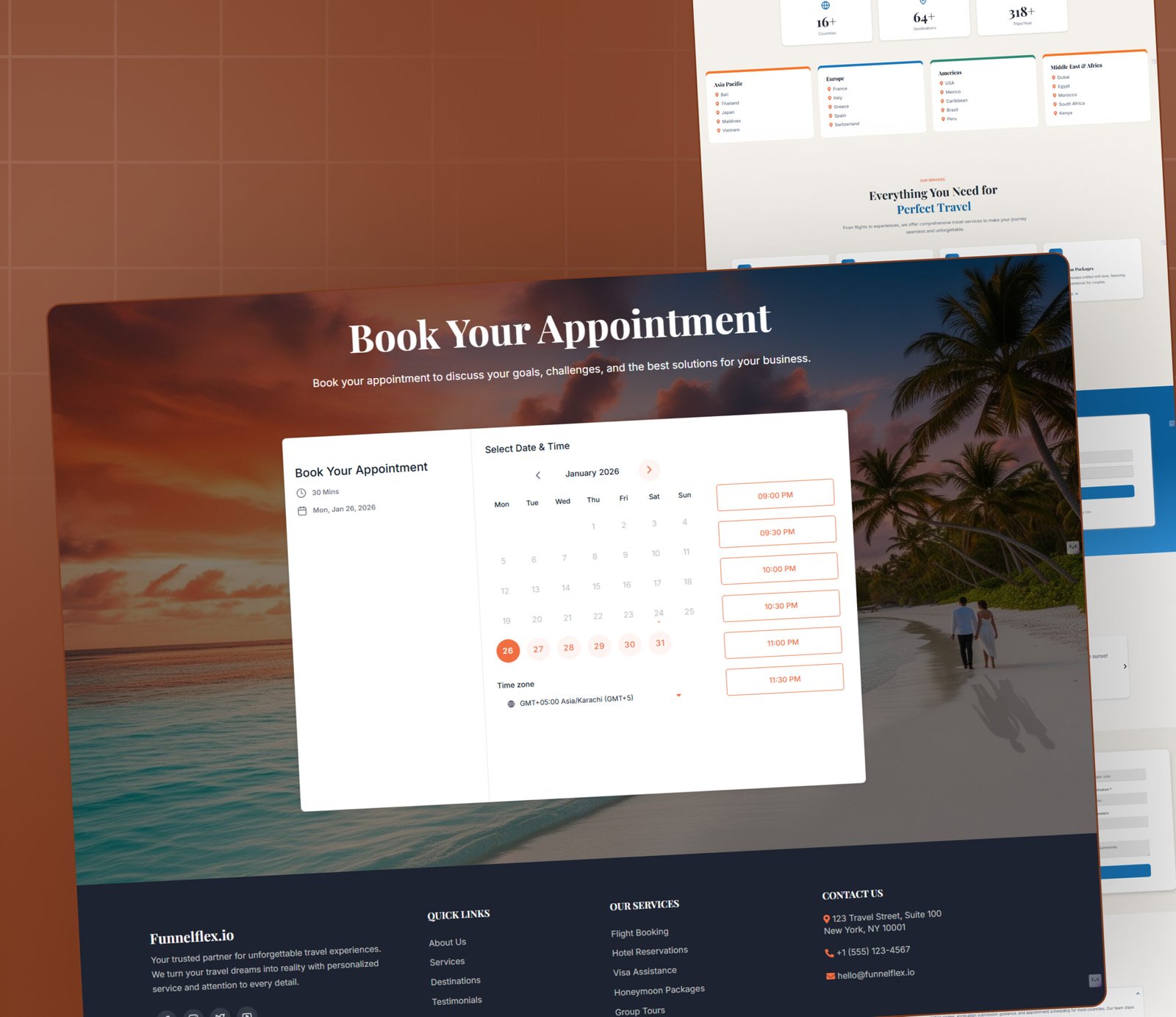 This page allows users to schedule a travel consultation call or trip planning session. Integrated with a calendar, it simplifies vacation planning without back-and-forth messaging.