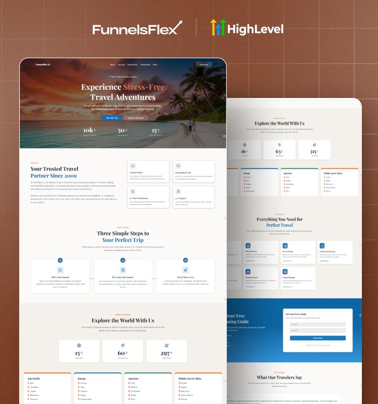 This GoHighLevel Travel Agency Funnel is designed for tour operators, tourism services, and vacation package sellers. It’s the perfect solution for those looking to capture leads, collect details, book calls or trips, and follow up automatically using GoHighLevel.